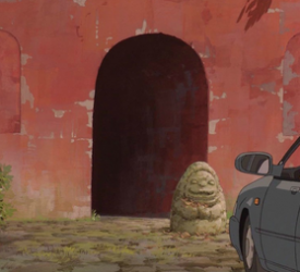 千尋が試練を受ける異界へ入っていく様子は、映画の中で幾重にも暗示される。父の運転する車が林の中に迷い込んだ時、まず鳥居が目に入る。次に石の祠。不思議な地蔵様のようなものも見える。これらは異界への案内と考えてもいいだろう。