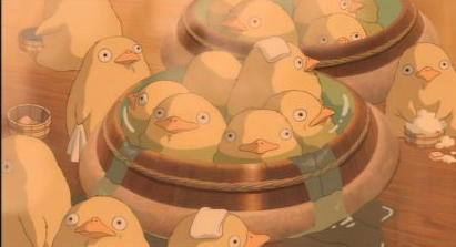 カオナシも千から渡されたニガダンゴを食べ、これまで溜め込んだ全てのものを吐き出す。最初の間はずっとハクに頼り切りだった主人公が、ここでは援助者を助け、それと同時に湯屋全体を救う役割を果たすようになったのである。