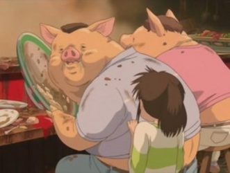 まず、前半の展開を辿ってみよう。トンネルを抜けた一家は、草原を越え、誰もいない歓楽街に入り込む。そこで、父母は食べるのに夢中になり、豚の姿に変えられてしまう。
