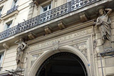 前を走るサン・ジェルマン大通りを横切ると、通りの名前cour du commerce de Saint Andréと書かれた建物が見える。