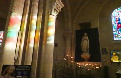 それに対して、柱には、重心を支える構造の上に細い柱が装飾として付け加えられ、大きな窓にはステンドグラスがはめ込まれている。それらは、ゴシック様式の特色といえる。