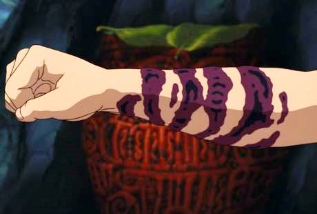 アシタカの腕は呪いを受けたために、 怒りを感じると、烈しく反応し、暴力的になる。