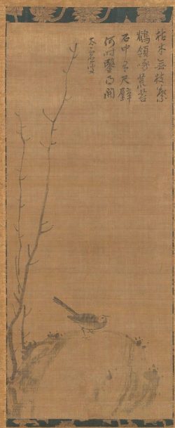 太虚元寿の「岩上鶺鴒(がんじょうせきれい)図」では、枝にとまる一羽のセキレイが、線の太さと墨の濃淡だけで、見事に表現されている。