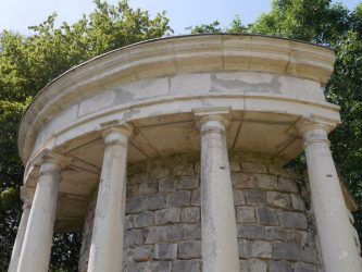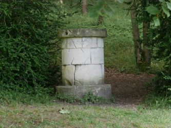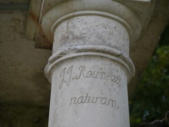 円柱には哲学者たちの名前が刻まれている。下の柱にはルソーの名前と自然という文字が見える。