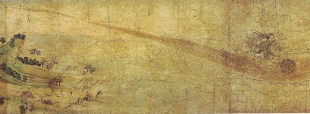 「信貴山縁起絵巻 剣の護法」の右側に描かれた童子は、天空を走り抜けている。