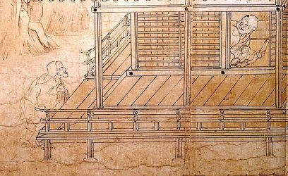 「信貴山縁起絵巻」の「命蓮と尼公の再会」の場面を見ると、建物は全て直線で描き出され、二人の人物の場を安定させている。