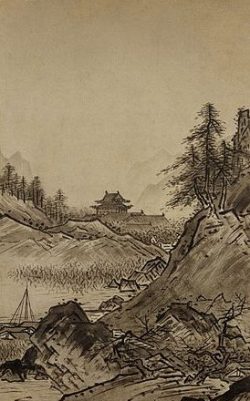 雪舟の水墨画は、岩だけではなく、木々も、カチカチとした線で描かれ、強固な感じを強く表出している。