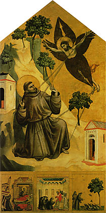 キリストが十字架に架けられた時にできた傷の跡が、聖人にも描かれるという伝説を描いた、ジヨットの絵画「聖痕を受ける聖フランチェスコ」。