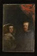中央の鏡に映るのは、画面には現れていないが、ベラスケスが描いている肖像画のモデルである、スペイン王夫妻。