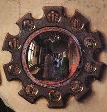 画面の中央に置かれた鏡の中には、アルノルフィーニ夫妻だけではなく、彼等を描く画家自身の姿まで描き出されている。