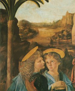 ちなみに、キリストの足元にひざまずく二人の天使のうち、外側にいる天使は、弟子のレオナルドが描いたものとして、広く知られている。