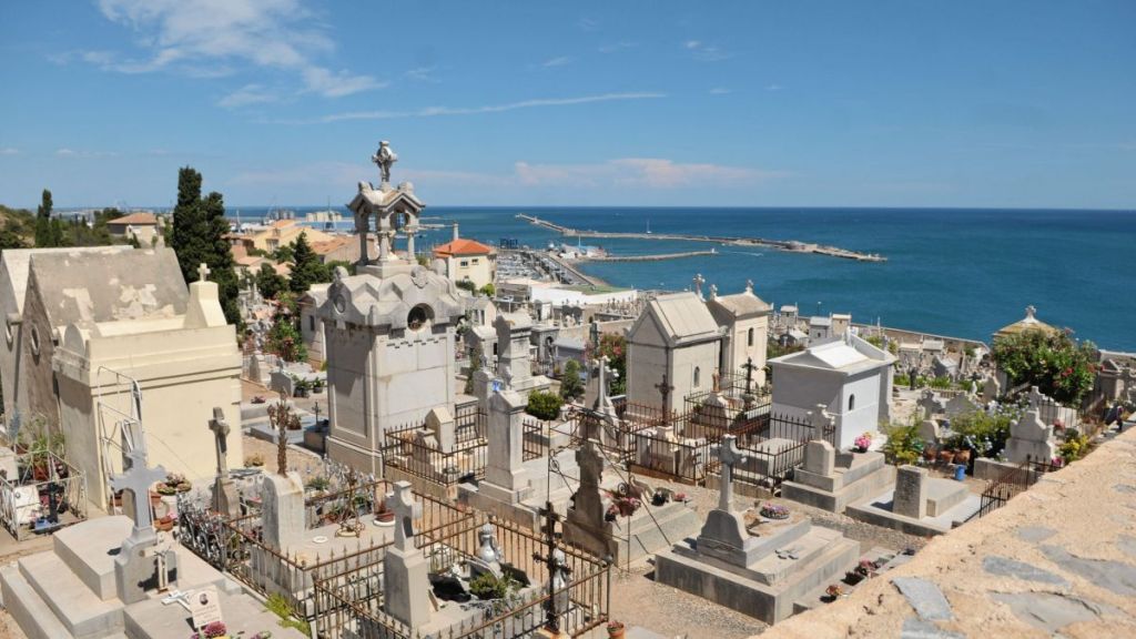 海辺の墓地の上には大きな空が広がり、岸辺には風が吹いている。