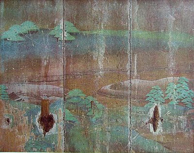 東寺の山水屏風(11世紀後半)に描かれた家屋や人物の服は、大陸風に描かれている。