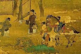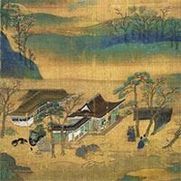 草堂の中で詩作にふけっているのは詩人の白楽天。馬と共にいるのは、詩人を訪れる貴公子とそのお供の者達だと考えられ、みんな唐風に描かれている。