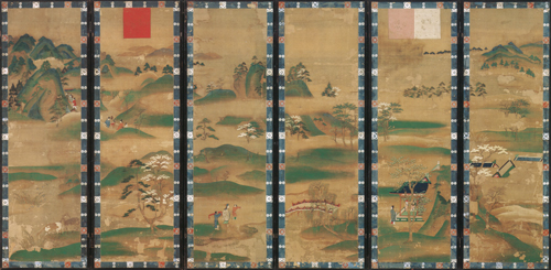 唐絵からやまと絵への移行を示す興味深い例は、2枚の代表的な仙水屏風。