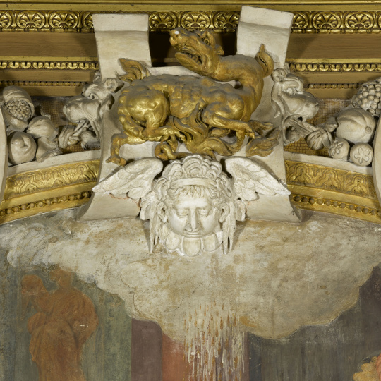 中央のフレスコ画で、象を取り囲むのは、ゼウス(天の王)とハデス(地獄の王)とポセイドン(水の王)であると考えられ、巨大な象は3つの世界を統括するフランソワ1世を表す。