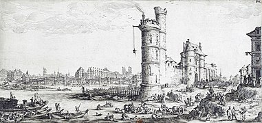 右手の奥に見えるのは、16世紀のパリの街。チュイルリーの宮殿やネールの塔等が描かれ、その前にはセーヌ河が流れている。