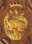 その下には、再び漆喰の天使が置かれ、最も下の段は、木製の羽目で覆われ、フランソワ1世の頭文字である F の文字が金色で刻まれている。