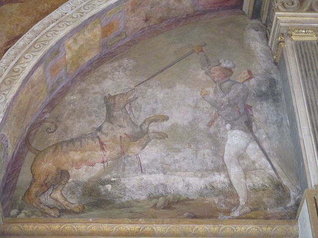 フォンテーヌブロー城の舞踏室の一角にあるニコロ・デッラバーテの作品「大山猫を退治するセバスチャン・ド・ラビュタン」。