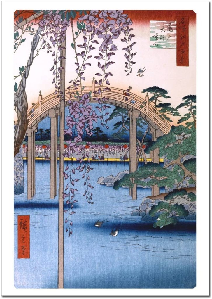 モネが描いた睡蓮の庭園の原形とも言われる 歌川広重の「名所江戸百景 亀戸天神境内」。ゴッホは、ラングロワ橋を見て、こうした浮世絵の構図を思い描いたのかもしれない。
