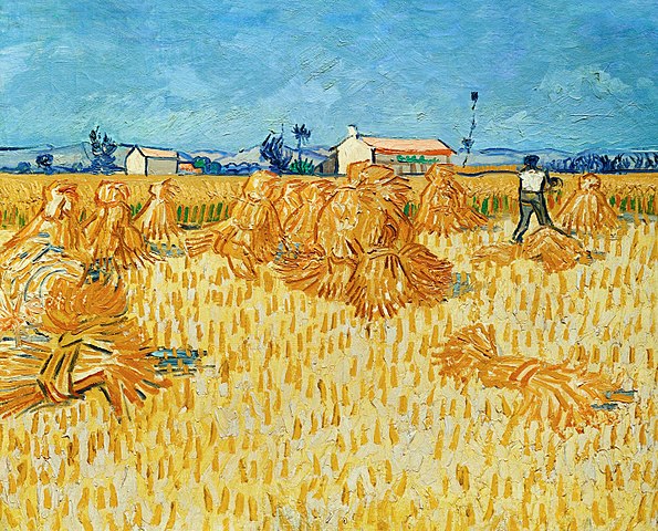 手前の青い大地が、後方の黄色い麦畑と、補色関係によってはっきりとした対照を生み出す。そして、無限に広がるように感じられる空間に、くっきりと黄色い太陽が位置を占め、短く太い絵具の塊が世界全体を光で包むように輝いている。