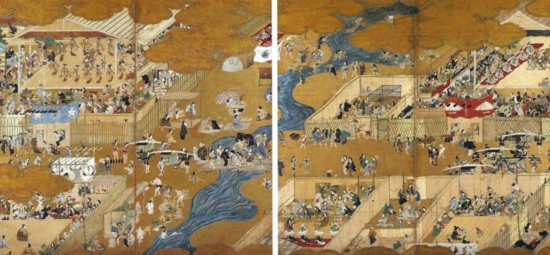 画面中央に鴨川が流れ、左隻と右隻それぞれに舞台が設けられているが、踊るのは、六条三筋町の遊女たち。周囲の賑わいが、女歌舞伎の流行を示している。
