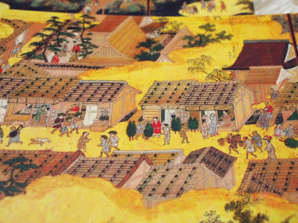 京都の市内と市外を俯瞰的に捉えたこの絵は、神社仏閣、武家屋敷、庶民の住居だけではなく、2800人を超える人々が描かれている。