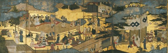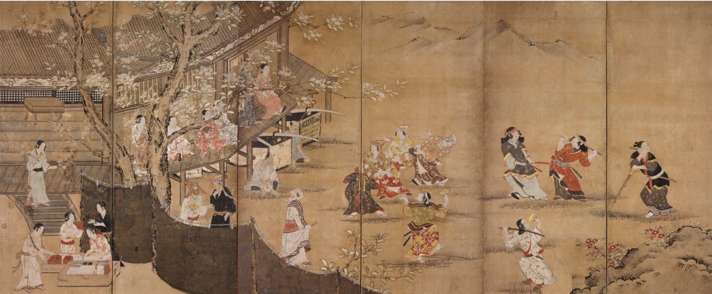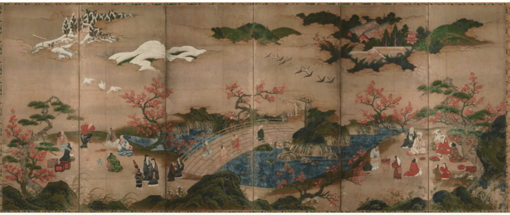 先に見た「高雄観楓図」と比べると、17世紀に描かれた「花下遊楽図」では、建物や木々に対して、人物の大きさが随分と違うことが一目でわかる。
