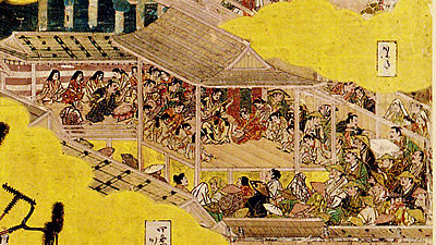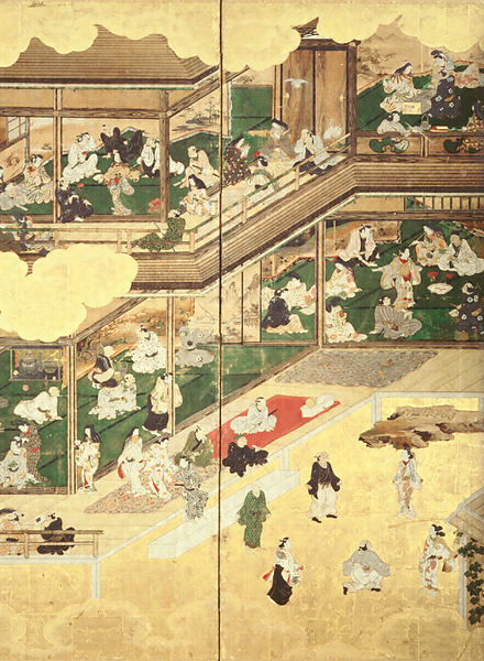 屋外では、能が演じられている舞台の小屋、その門前の茶屋、見せ物小屋、水辺における野外の宴などが描かれている。