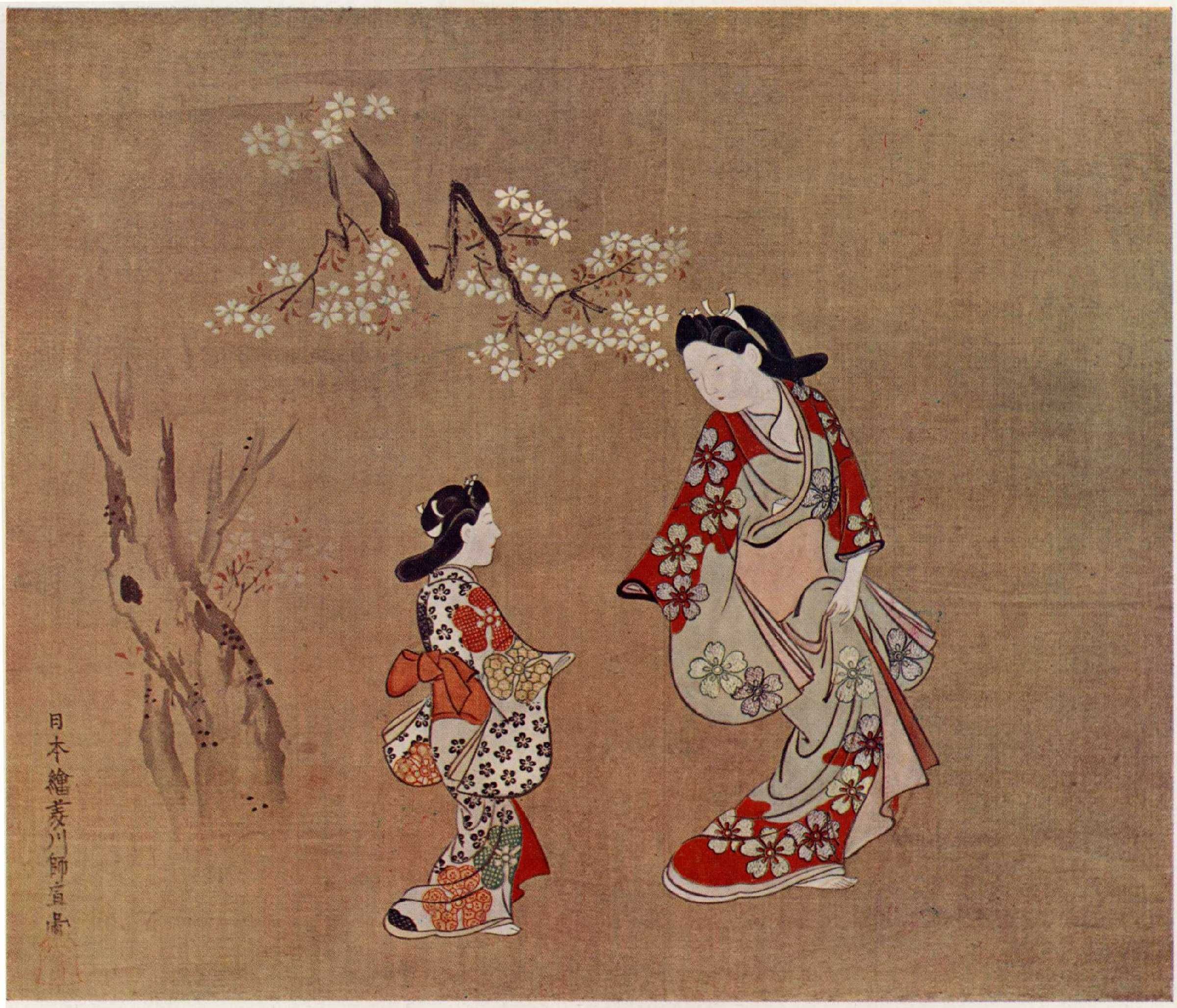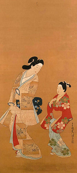 「美人遊歩図.」でも、「二美人図」でも、一目見れば菱川師宣の作品とわかるほど、彼の美女たちは優雅に洗練された美を表現している。