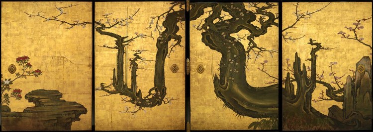 背景全体を金箔で覆い尽くした豪華金襴たる襖絵は、天下統一を成し遂げようとする武士たちの精神をそのまま表現しているように見える。力強い木々の枝が画面を突き抜け、躍動感がみなぎっている。