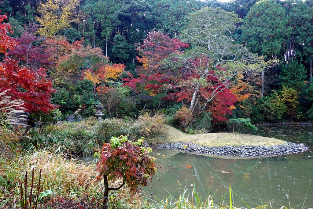 境内の中心に位置する池には中島があり、中央に弁天祠が置かれて、先端は荒磯風の州浜に立石が置かれている。