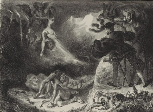 Comme Faust lui-même descendant vers les Mères, la muse du poète ne sait où poser le pied, et ne peut même tendre son vol, dans une atmosphère où l’air manque, plus incertain que la vague et plus vide encore que l’éther. Au delà des cercles infernaux du Dante, descendant à un abîme borné ; au delà des régions splendides de son paradis catholique, embrassant toutes les sphères célestes, il y a encore plus loin et plus loin le vide, dont l’œil de Dieu même ne peut apercevoir la fin. Il semble que la Création aille toujours s’épanouissant dans cet espace inépuisable, et que l’immortalité de l’intelligence suprême s’emploie à conquérir toujours cet empire du néant et de la nuit.