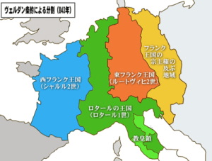 シャルルマーニュが樹立したフランク王国は、大帝の死後、孫の世代になり三分割される。
