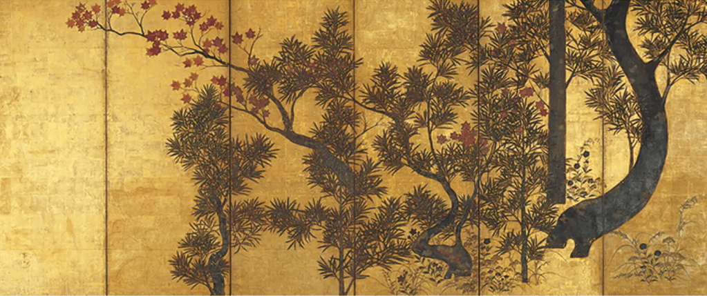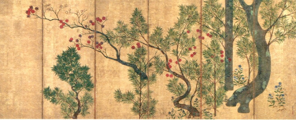 宗達の楓の木の曲がり具合、槙の木の密集する様子や曲線の組み合わせは、奥行きを感じさせる。