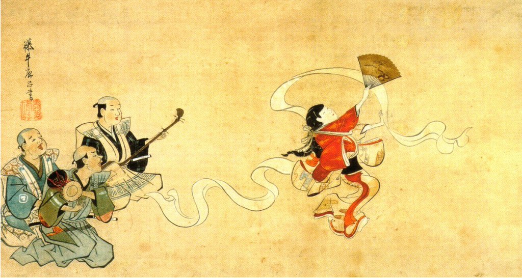 3人の囃方から舞妓の扇へと向かう、画面左下から右上への向かう構図を基本にし、舞妓は空中に踊り上がるように踊っている。三味線の棹がその方向性を示し、舞妓の肩と腕が並行にして上昇の曲線を描き、顔はさらに上にある扇子を見上げる。