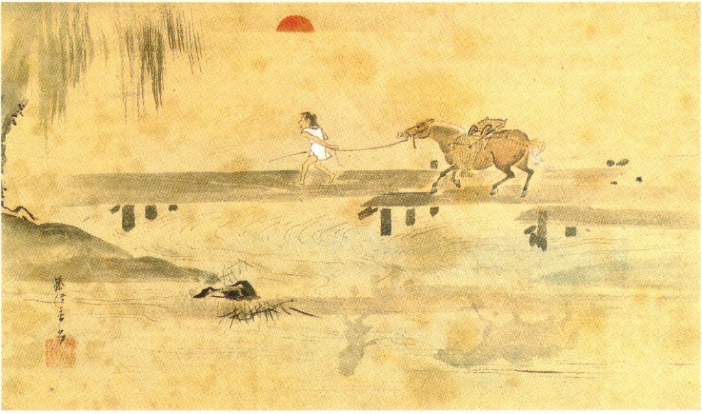 「朝暾曳馬(ちょうとんえいば)図」の最大の特色は、水の上に映った人と馬の影の製造。日本の絵画の伝統の中で、これまで水面の影を描くことはなかったという。