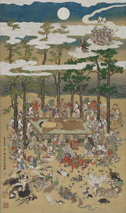 涅槃図(ねはんず)とは、釈迦が入滅する時の様子を描いたもので、基本的には右手を枕にし、頭は北向き、顔は西向きで描かれる。