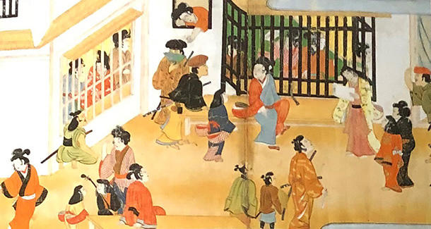 ここで、遊郭を描いた風俗画から、室内の人物たちへ、そして寛文美人画へと至る過程を見ておこう。