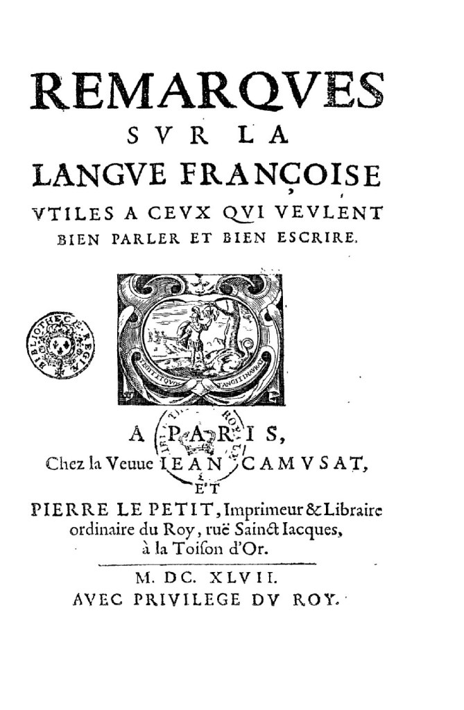 1647年になると、文法学者ヴォージュラが、『正しく話し書くことを望む人々にとって有益となる、フランス語に関する覚書き』を出版。宮廷で使われている言葉を基本にして、フランス語の正しい慣用を定めようとした。