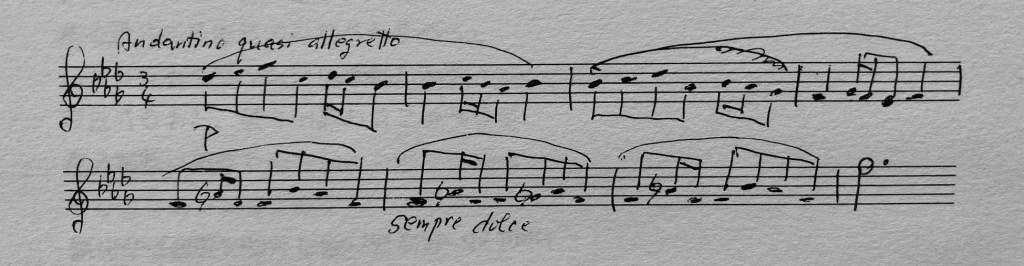 pで出発した音楽は、しばらくして中間部(「悲しくて美しい月の光は」)の変ト長調のアルペッジョで更にppにまで弱くなり、最後にはエスプレシーヴォ・エ・ドルチェ(表情豊かに、でも優しく)になりはしても、ffはおろか1個のfさえ、指定されていない。でも、いつも低音(こごえ)でそっと口ずさめば良いというものではないことは、センプレ・ドルチェ(いつも優しく)、センプレ・カンタービレ(いつも歌って)という二つの書きこみと小さなクレッシェンドが三つつけてあるのをみればわかる。