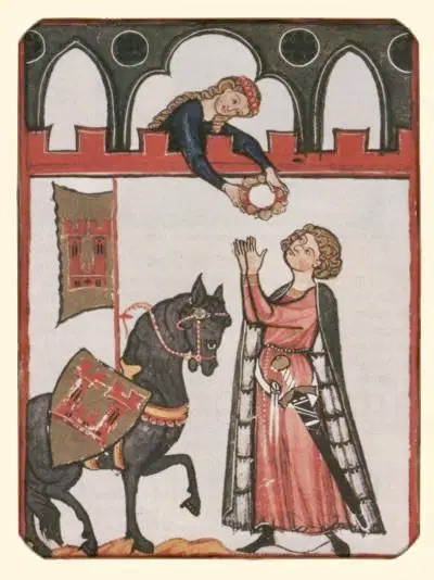 騎乗槍試合の時には、夫人にだけわかる配色の服やリボンを身につける。これも宮廷風恋愛で常に見られる行動である。