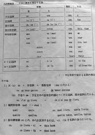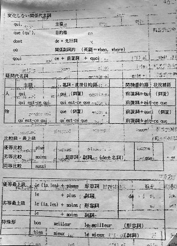同じ見出しで、日本語、英語、フランス語などを読み比べると、読解力にアップにもつながるし、それぞれの言語の表現の仕方も比較できる。 - 文法において、動詞や名詞に関係する語の形態の変化については、一覧表を作り、見返すことで、徐々に覚えることができる。(下記参照)