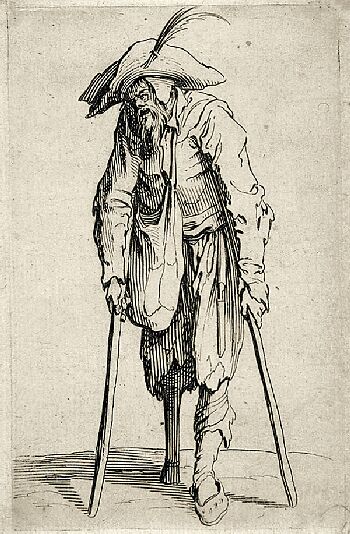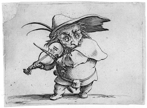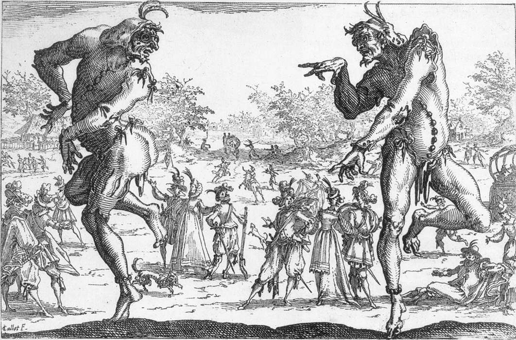 カロには、現実を版画に写し取るリアルな表現だけではなく、貧しい人々の生の姿や、イタリアで見た喜劇(コメディア・デラルテ)の役者たちを、ある時にはリアルに、別の時には風刺的に描いた作品もある。
