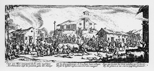カロの代表作となった「戦争の惨禍」は、そうした戦いの様子を版画にしたもの。18枚の連作には、兵士が町や至るところで略奪と放火を行い、人々を木に吊して処刑する様子等が描かれている。