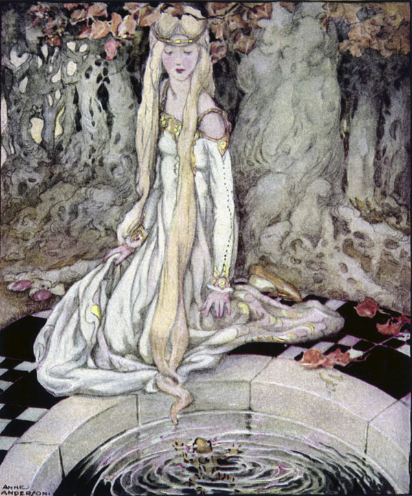 王さまの末の娘が森へ出かけていきました。そして冷たい泉のほとりに腰をおろしました。それから金のまりをとりだして、それで遊びました。