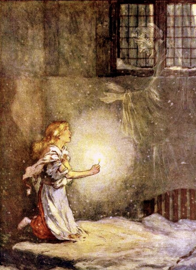 寒さに震え、わずかな暖を取るために、売り物のマッチをする。その度に、マッチは少女を暖め、おいしそうな食べ物やきれいなクリスマスツリーを見せてくれる。闇にしんしんと降る雪。そして、かすかなマッチの炎。