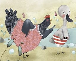 アヒルの子は、太陽の下で水浴びをすることを望み、気持ちよさを口にしているだけである。しかし、そんなことを考えもつかないニワトリは、アヒルの子の考えが馬鹿げていると頭から決めつけ、おばあさんやネコの利口さに言及する。