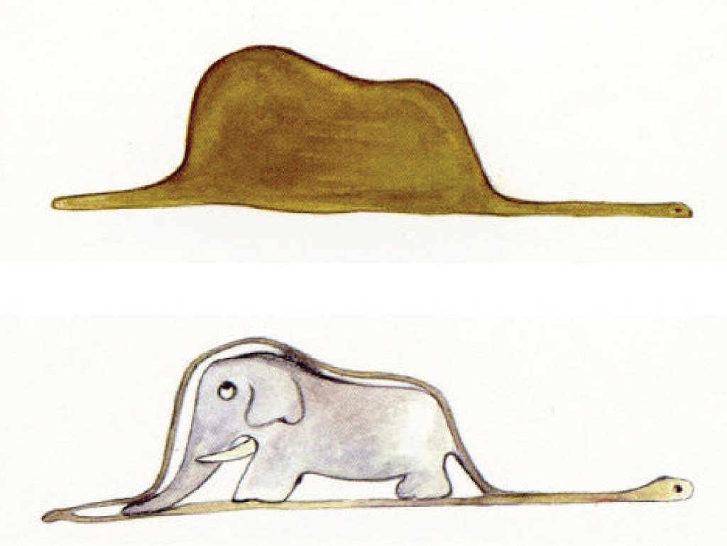 帽子の形をした絵を見て、象を飲み込んだボアの絵だとわかる人はいないだろう。たとえ子どもが見ても、帽子の絵としか見えない。にもかかわらず、大人というのは、内側の象の絵を描いてあげないと何かわからない。このように書くことで、大人における想像力の欠如を非難する。