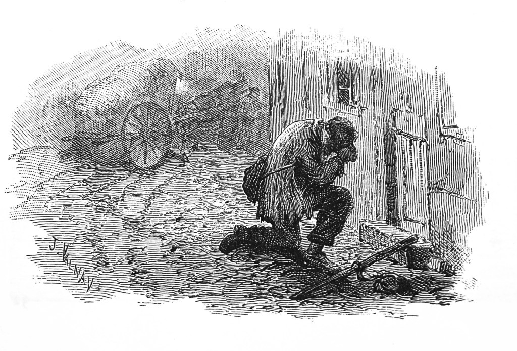 どれだけの間、彼はこんな風にして泣いただろ? 泣いた後で、何をしたのだろう? どこに行ったのだろう? 誰もそれを知らなかった。ただ、明らかだと思われるのは、まさにその夜、当時グルノーブルとの行き来をしていた馬車の御者が、朝の3時頃ディーユに到着し、司教館のある通りにさしかかった時、一人の男を見たことだった。その男は、舗石に跪き、影の中、ビヤンヴニュ閣下の館の扉の前で、祈る姿をしていた。